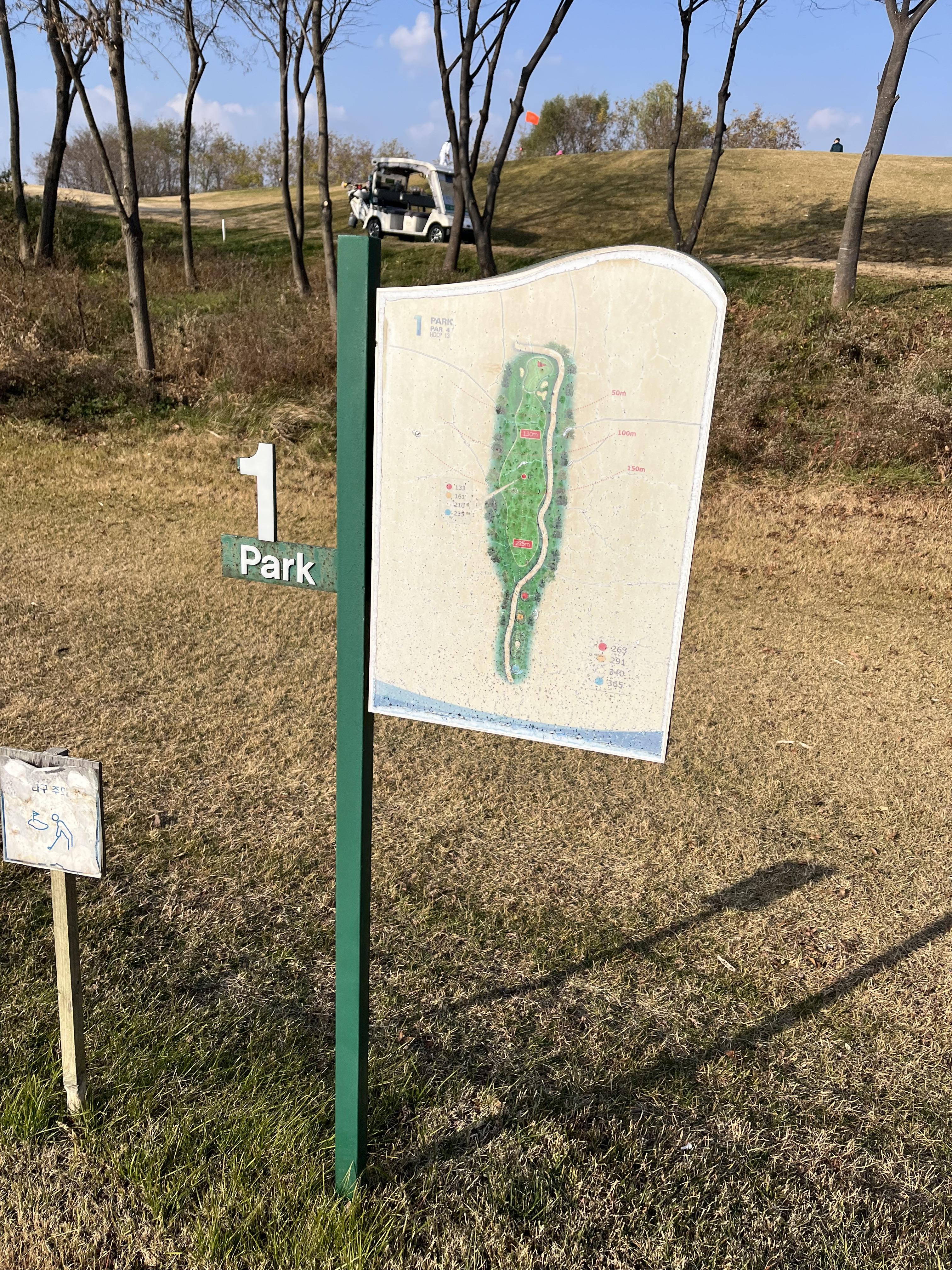 파크코스 OUT 첫 홀은 PAR4이며 시야가 확트여서 티샷 하기 매우 좋습니다. 티박스는 매트를 걷어 잔디에서 티샷을 진행하고 있으며 페어웨이는 푸른 잔디가 아직 덜 올라왔네요 :)